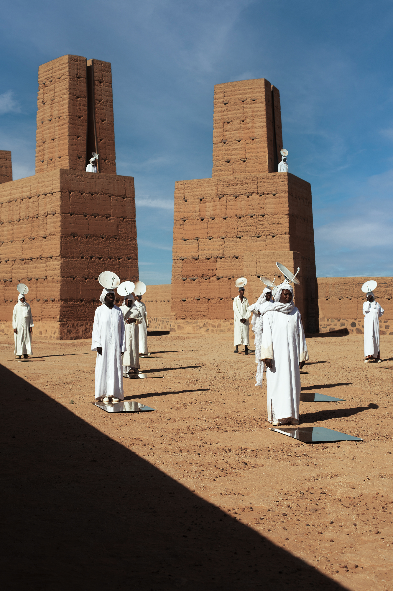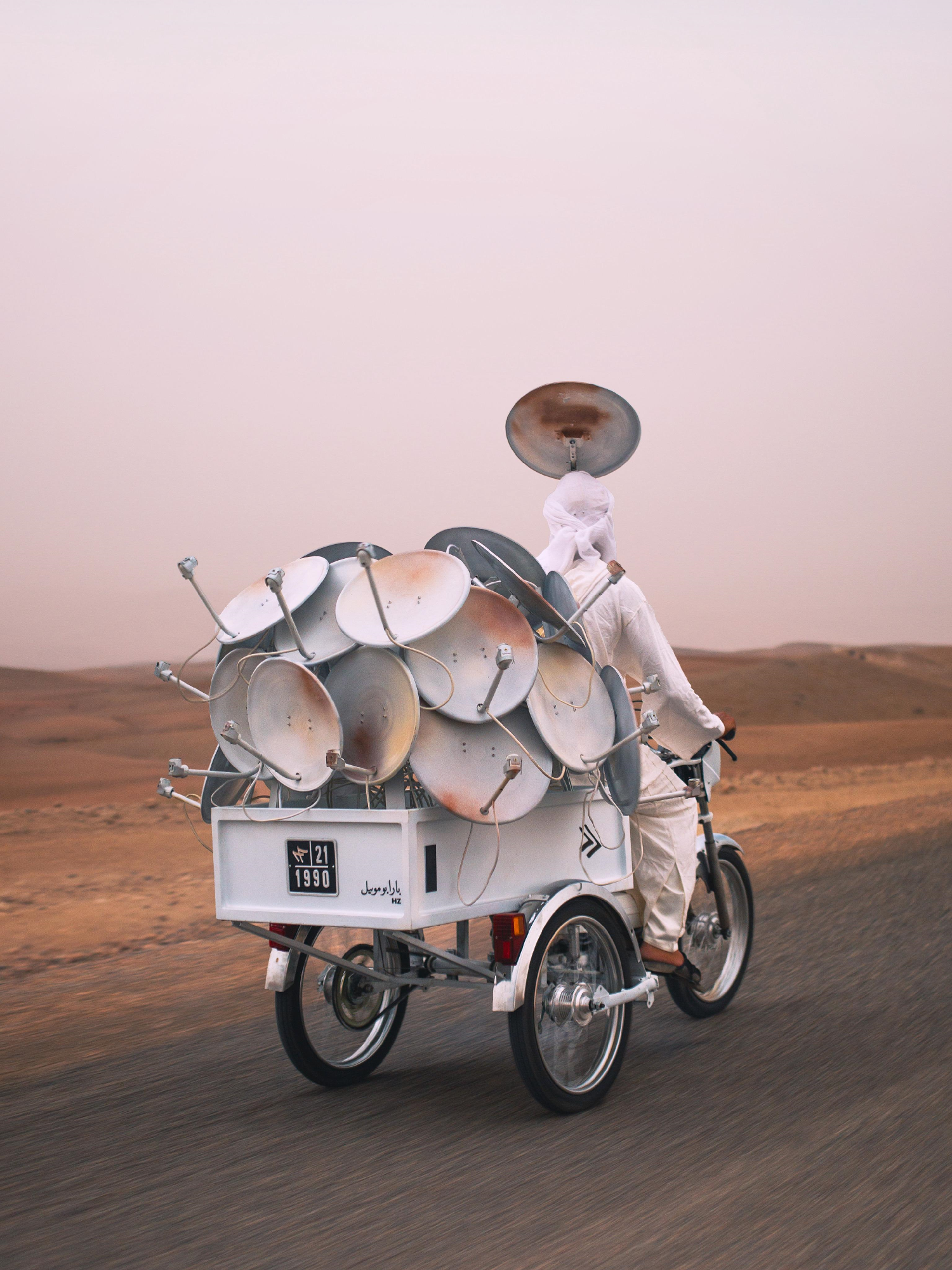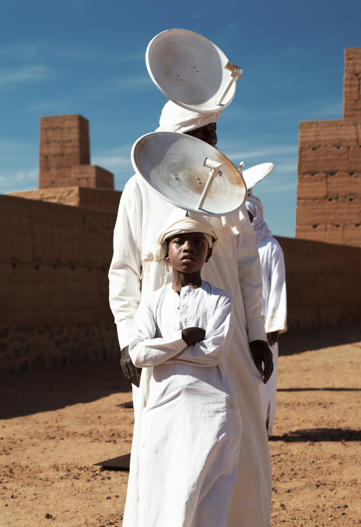 The film opens in Douar Hajja, a neighborhood on Rabat’s periphery that she has long explored and reimagined as the Hertz Republic in her series. Rooftops bristle with satellite dishes, looming over nearly shuttered windows. A sacred book is read from top to bottom, grounding oneself deeper in transmitted values. Yet the parabole, the satellite dish, and the agal (a traditional Arab accessory typically worn by men to secure the headdress) each imbued with numinous forces, stand sentinel over those who seek a world unbound. Baddou’s imaginary Hertzian calligraphic works adorn a passport stamped along the journey between earth and sky, purporting the depth of ‘Paraboles: La Sacralisation des Images’ into spatial dimensions through a dialogue between Hans Voth’s cosmic architectures and the project’s photographic gaze.
