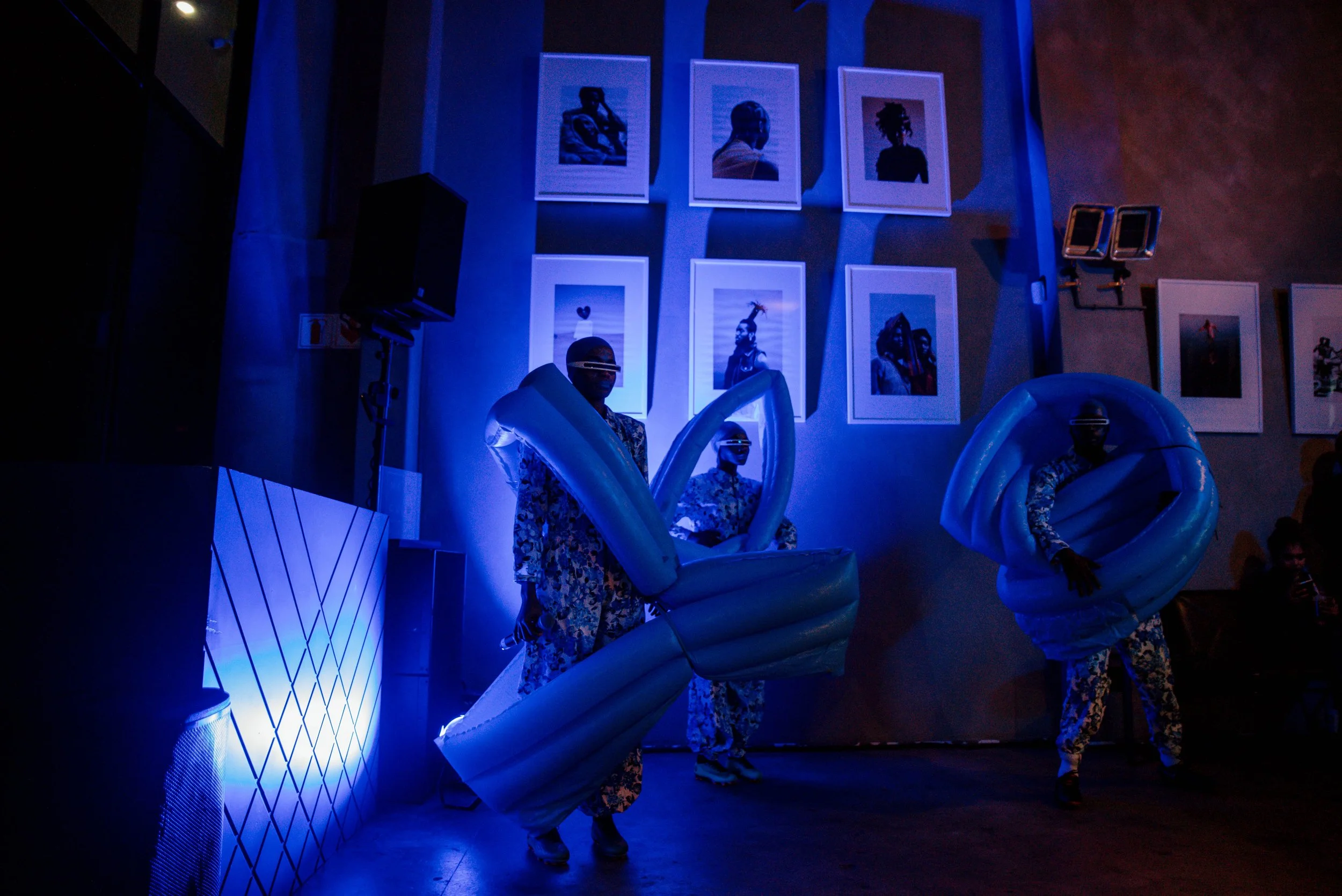 Artist and musician Manthe Ribane brought the gallery alive with her performance alongside her siblings as Dear Ribane. The trio wore extravagant blue balloon costumes, their movements echoing and amplifying her evocative and ethereal sounds.